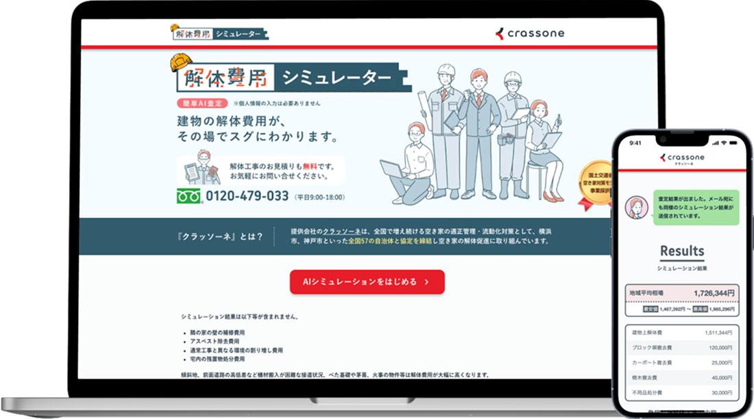 当社は、解体工事領域で、全国2,300社以上の専門工事会社と施主をマッチングするサービス「クラッソーネ」を運営しており、これまでに累計16万件以上のご利用者実績(※2)があります。また、「解体費用シミュレーター」や「すまいの終活ナビ」を利用した公民連携での空き家対策事業が、令和3年度から令和5年度の国土交通省「住宅市場を活用した空き家対策モデル事業」に3年連続で採択され、現在は全国199自治体(3月31日時点)と公民連携による空き家対策を進めています。